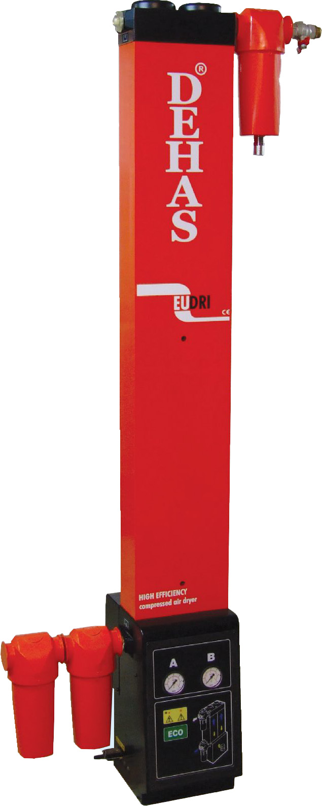 EUDRI Basınçlı hava kurutucuları ürün yelpazesi – 46 derecelik çiğ noktaları elde etmek maksadıyla en gelişmiş teknoloji kullanılarak basınçlı havadan nemi gidermek amacı ile tasarlanmıştır. EUDRI Kurutucu ürünleri en az bakım gerektirecek şekilde tasarlanmış olup, hemen hemen her yere monte edilebilir. EUDRI Kurutucu alüminyum bir kolonla birleştirilmiş bir giriş ve bir çıkış manifoldundan oluşmaktadır. Kolonda kurutucu maddeyle dolu ikiz hazneler bulunmaktadır, Çalıştırma sırasında. bir hazne hatta bağlı (kurutma) İken. diğer hazne Basınç Değişimli Adsorpsiyon (BDA) prosesini kullanarak yeniden üretim yapar. Basınç Değişimli Adsorpsiyon (BDA) Kurutucu çıkış akışından küçük bir yüzde hava alınır ve kurutulmuş hava hat basıncından atmosferik basınca yayılarak yeniden doymuş hazne oluşturmak için kullanılır. Bu işlem sırasında nem yeniden oluşum haznesinden fiziksel olarak giderilerek egzoz susturucuları yoluyla atmosfere salınır.