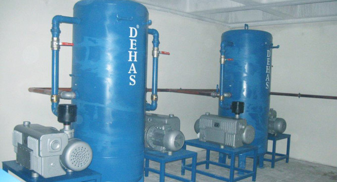 Dehas Vakum Santralı Avrupa Standartlarına göre; hesaplamalar sonucunda gerekli vakum debisi hesaplanarak sisteme 580 mm/Hg vakum basıncı sağlayacak şekilde dizayn edilmekte ve üretilmektedir. Pompalar rotatif, döner kanatlı yağ halkalı ve yağsız tip şeklinde imal edilebilmektedir.